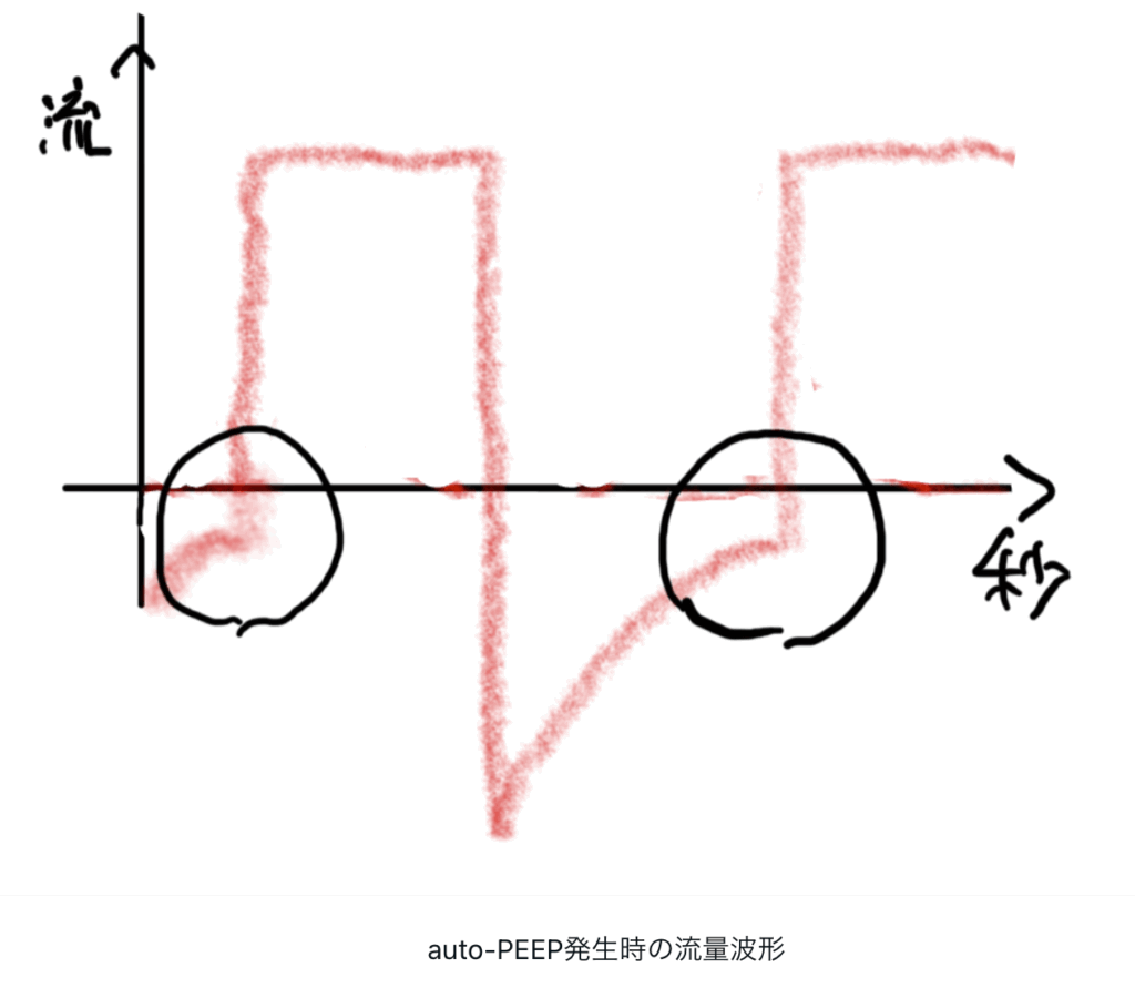 フロ―波形が次吸気前にゼロへ戻らない=auto‑PEEPのサインがある場合,重度なら回路一時離断でデコンプレッション(完全に呼気を逃がす)も行うことがあります.