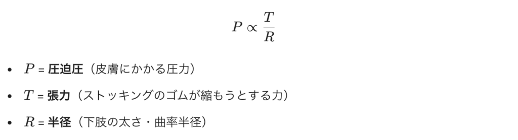 - 圧迫圧(P)は張力(T)が高いほど,また半径(R)が大きいほど強くなるという法則です.つまり,「同じ強さのゴム(張力)でも,巻く場所の半径が小さい(細い)ほど,皮膚にかかる圧力は強くなる」ということです.
