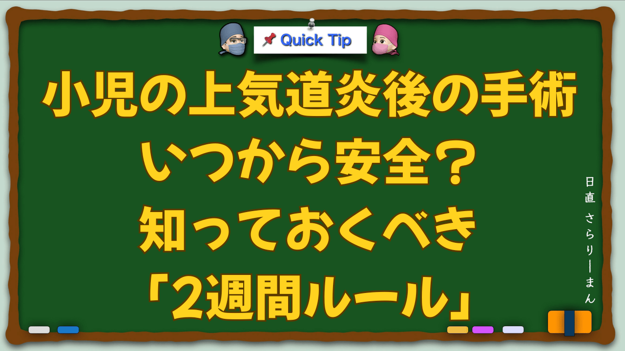 エビデンスでは,風邪後2週間以内に麻酔を受けた子どもは,喉頭痙攣・気管支痙攣・酸素飽和度低下などの呼吸器合併症リスクが2〜7倍に上昇すると報告されています.